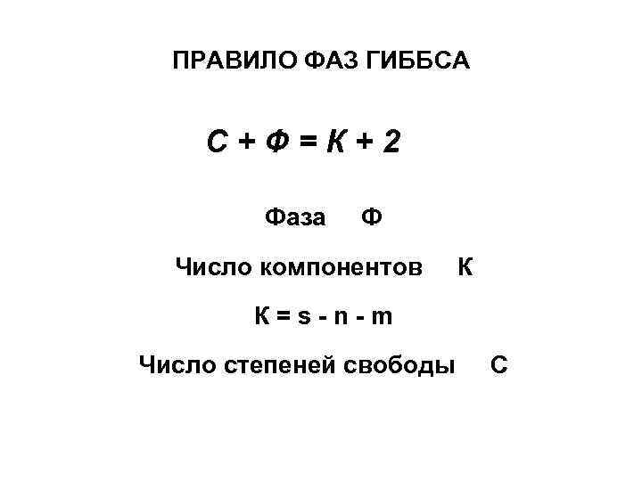 ПРАВИЛО ФАЗ ГИББСА С+Ф=К+2 Фаза Ф Число компонентов К К=s-n-m Число степеней свободы С
