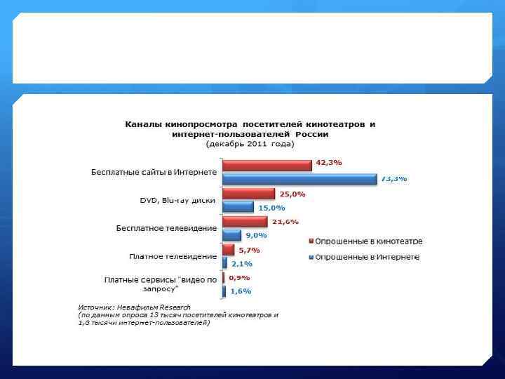 Онлайн кинотеатры: перспективы нового бизнеса Ø 10 000 скачиваний фильмов в месяц — вот оптимальное число, к которому необходимо приблизиться для того, чтобы проект стал приносить прибыль. Ø За просмотр фильма зритель платит в среднем от 10 до 100 рублей Ø «Заплати сам, сколько найдёшь нужным» или «Поблагодарить за фильм» Ø Три — четыре непиратских онлайн кинотеатра — это всё чем на сегодня располагает статистика рынка в России.