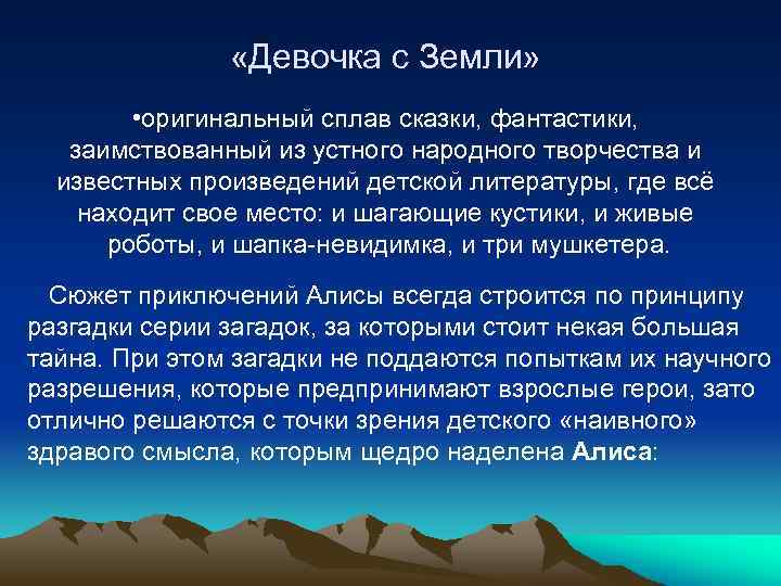«Девочка с Земли» • оригинальный сплав сказки, фантастики, заимствованный из устного народного творчества и известных произведений детской литературы, где всё находит свое место: и шагающие кустики, и живые роботы, и шапка-невидимка, и три мушкетера. Сюжет приключений Алисы всегда строится по принципу разгадки серии загадок, за которыми стоит некая большая тайна. При этом загадки не поддаются попыткам их научного разрешения, которые предпринимают взрослые герои, зато отлично решаются с точки зрения детского «наивного» здравого смысла, которым щедро наделена Алиса: