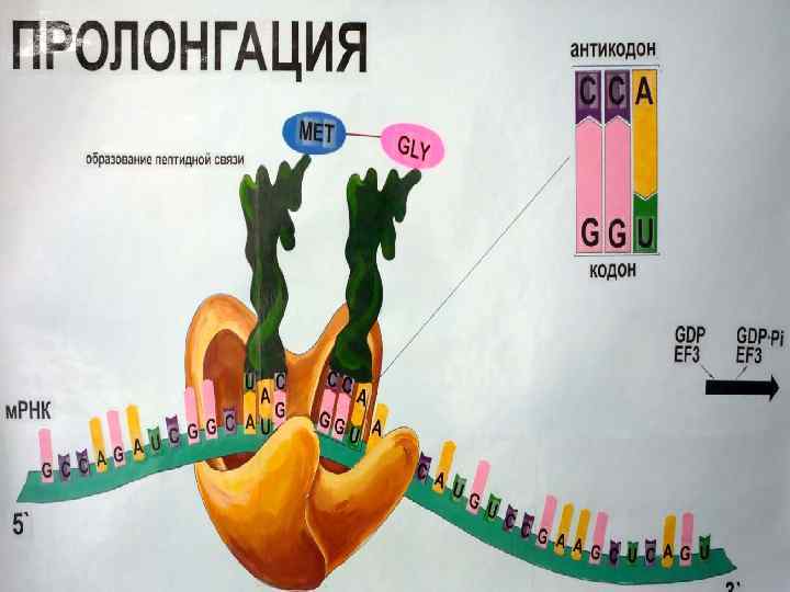 Этап 3: элонгация • Далее полипептидная цепь удлиняется за счет последовательного ковалентного присоединения АК, каждая из которых доставляется к рибосоме и встраивается в определенное положение с помощью соответствующей т. РНК, образующей комплементарные пары с отвечающим ей кодоном в м. РНК.
