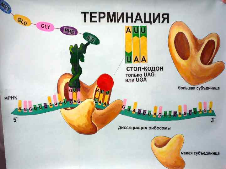 Этап 4: терминация и высвобождение полипептида • О завершения синтеза полипептидной цепи сигнализирует терминирующий кодон м. РНК, происходит высвобождение полипептида из рибосомы при участии особых «рилизинг» -факторов (от англ. release высвобождать), или факторов терминации.