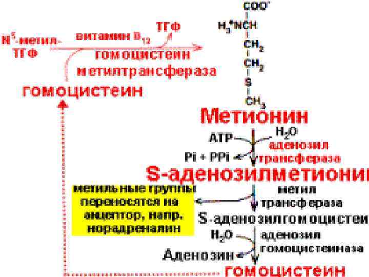 Тетрагидрофолевая кислота • Фолатредуктаза с участием НАДФН синт. восстановленная фолиевая кислота — тетрагидрофолиевая кислота [ТГФК] — входит в состав ферментов, осуществляющих перенос одноуглеродных фрагментов (С 1 -метаболизм).