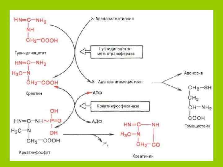 • Креатин: почки, печень, подж. ж-за 0, 1 -0, 4 г/кг; • Скелетные мышцы – 25 -55 г/кг; • Сердце – 15 -30 г/кг; ГМ – 10 -15 г/кг • С мочой у детей –креатин и креатинин • У взрослых креатинин - 4, 4 -17, 6 ммоль/сутки