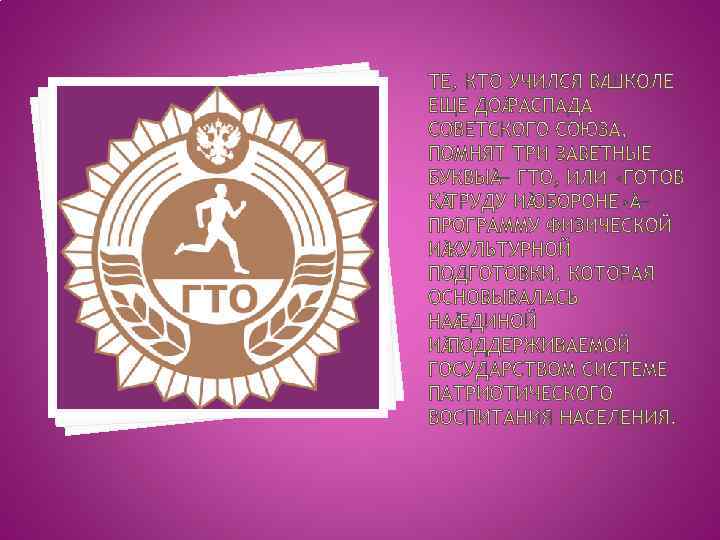 Готов к труду и обороне (ГТО) — разрабатываемая программная и нормативная основа физического воспитания населения России. Регулируется "Положением о Всероссийском физкультурно-спортивном комплексе «Готов к труду и обороне» ".