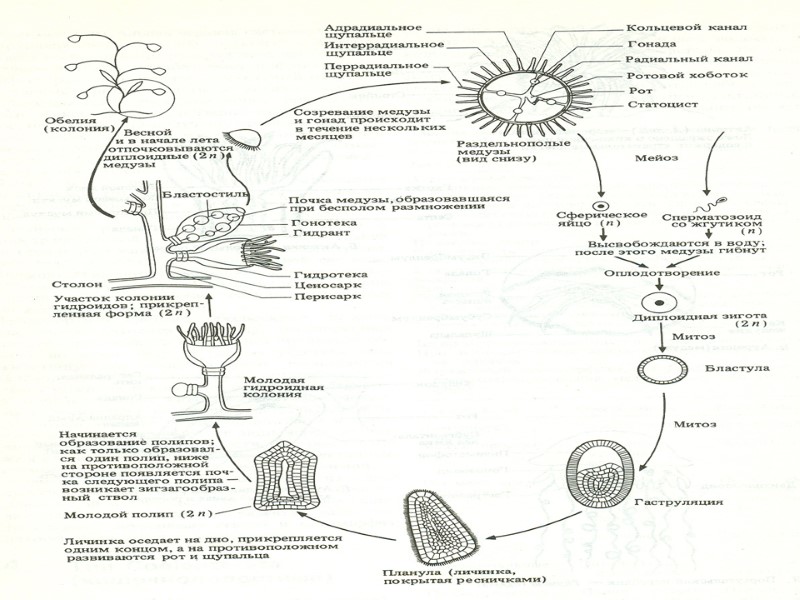 Колонии у обелии состоят из множества гидроидных полипов, соединенных между собой полой трубочкой--ценосарком, которая проходит через всю колонию. Ценосарк секретирует наружный защитный слой из хитина. Все гидранты (отдельные полипы) способны питаться, вещества распределяются на всю колонию. Медуза– это пелагическая форма обелии, ее половое поколение. Она имеет колоколообразную форму и похожа на перевернутый полип. Снаружи– эктодерма. Ротовое отверстие ведет в гастральную полость, от которой отходят четыре радиальных канала по направлению к краю зонта, где они соединяются кольцевым каналом. Обелия-медуза Медуза имеет гонады, где в результате мейотического деления образуются гаметы: либо яйцеклетки, либо сперматозоиды, так как медузы раздельнополы. Гаметы выходят наружу в результате разрыва гонад. Медуза после этого погибает. Медуза—активно плавающее животное, передвигается реактивным способом, используя свой зонтик.