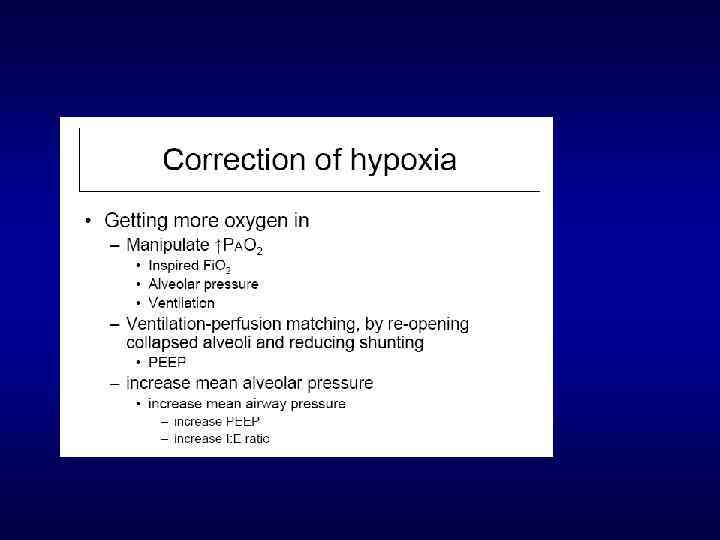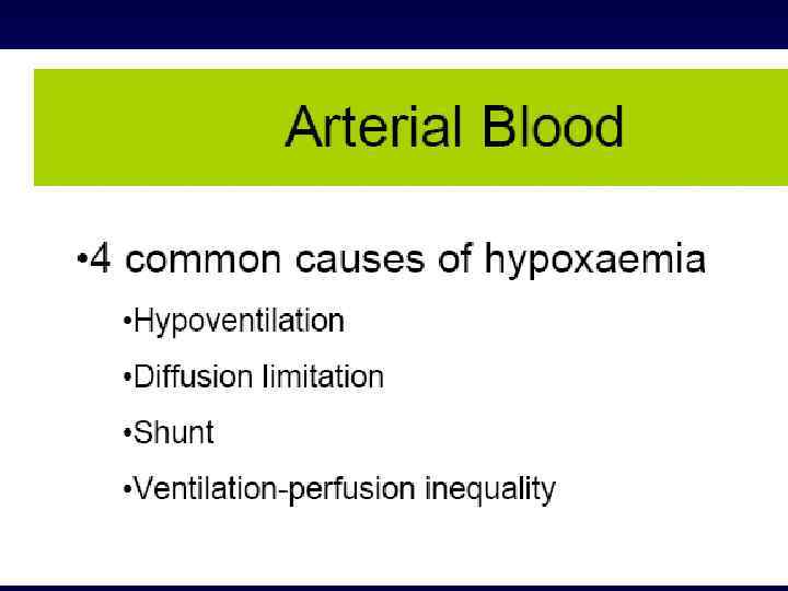 Гипоксия Гипоксическая (гипоксемия) - низкая Fi. O 2 - гиповентиляция - нарушения V/Q - шунт Гемическая - анемия - блокада Нв Циркуляторная Цитопатическая (дизоксия)