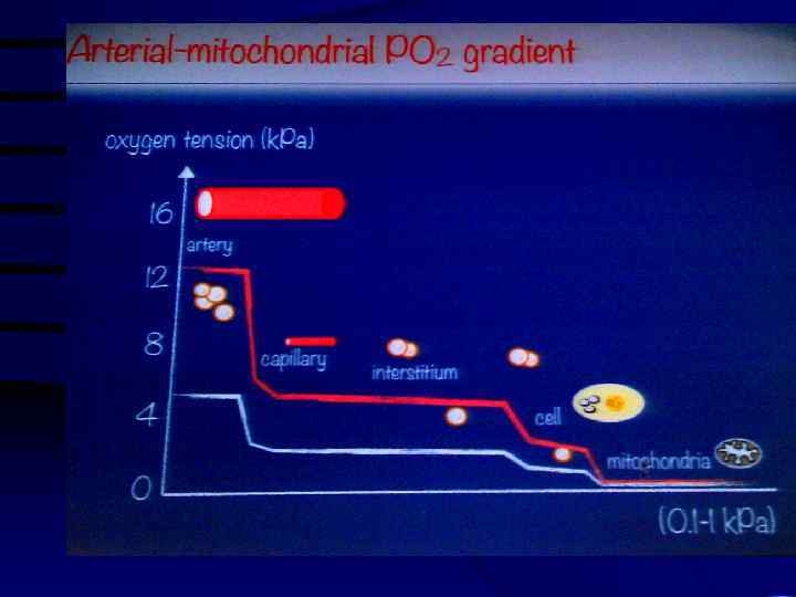 Кислородный каскад ани тк РО 2 мм рт ст ≈ к. Па 7, 5 мм рт ст 150 к. Па 100 ткани артерия лёгочные капилляры альвеолярный газ атмосфера 0 увлажнённый воздух 50 дриях он митох р. О 2 в т м рт с ткани <1 м