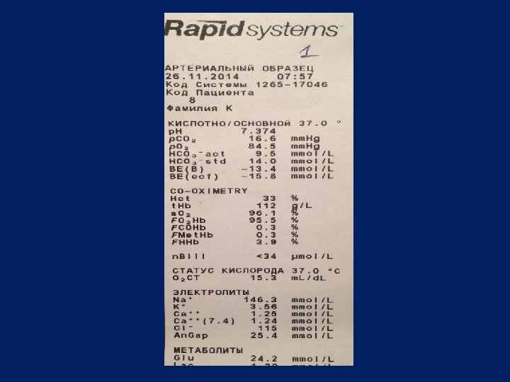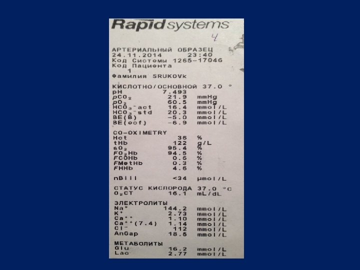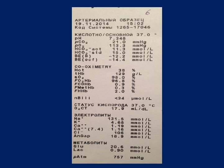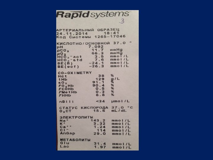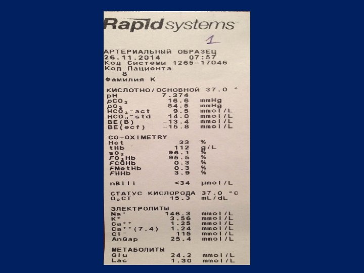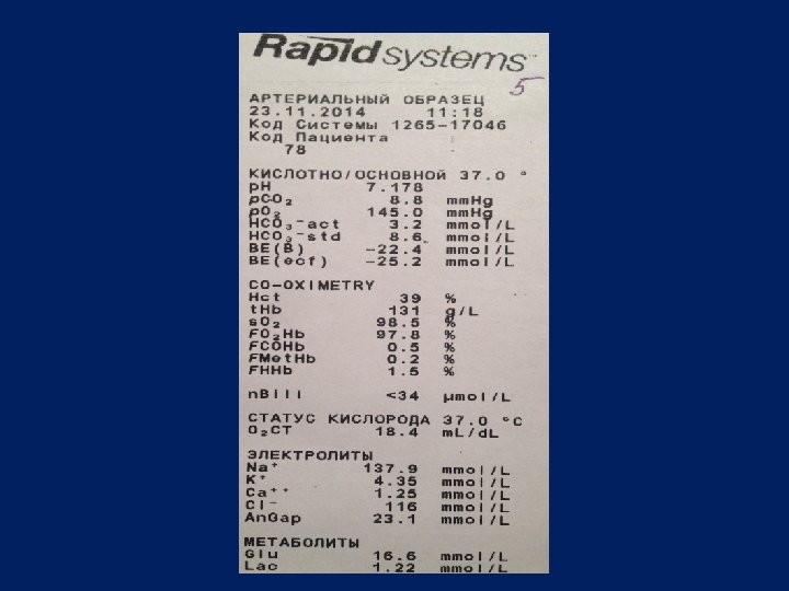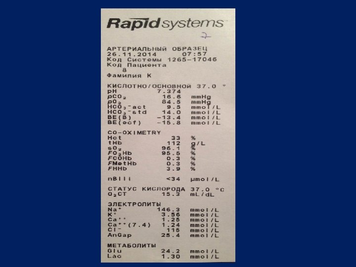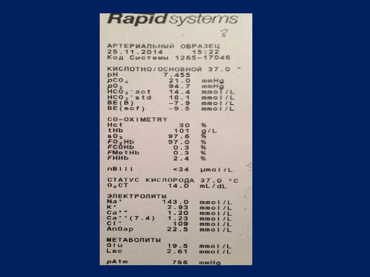 p. O 2 Парциальное давление кислорода p. CO 2 Парциальное давление углекислого газа p. H р. Н K+ Калий Na + Натрий Cl - Хлор Ca ++ Glu Кальций ионизированный Lac Лактат n. Bil Неонатальный билирубин t. Hb Общий гемоглобин FO 2 Hb Оксигемоглобин FHHb Дезоксигемоглобин (восстановл. гемоглобин) FMet. Hb Метгемоглобин FCOHb Карбоксигемоглобин p. Atm Давление атмосферного воздуха Глюкоза