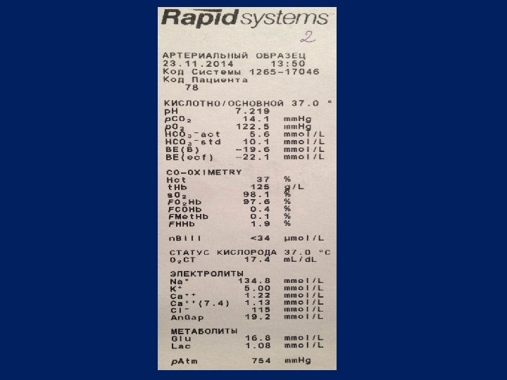 Правильная интерпретация результатов р. Н р. СО 2 интерпретация ↓ ↑ Респираторный ацидоз ↓ N Метаболический ацидоз ↓ ↓ Метаболический ацидоз