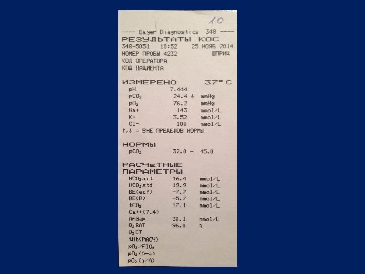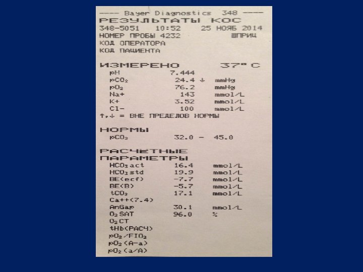 Правильная интерпретация результатов р. Н р. СО 2 интерпретация N ↑ Смешанная форма респираторного ацидоза и метаболического алкалоза N ↓ Смешанная форма дыхательного алкалоза и метаболического ацидоза N N N, но не исключает смешанный метаболический ацидоз/алкалоз. Определить анионную разницу