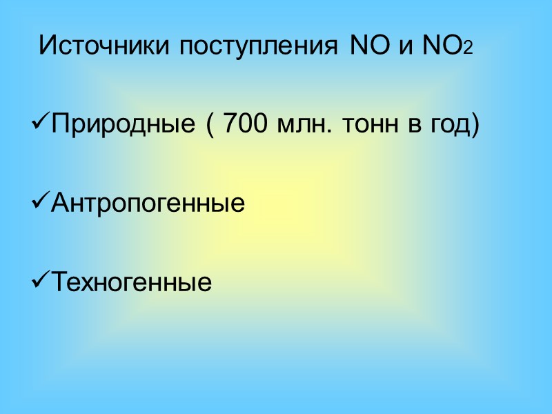 Природные ( 700 млн. тонн в год) Антропогенные Техногенные Источники поступления NO и NO2