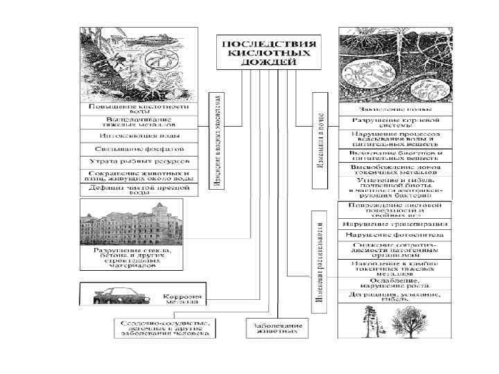Механизм образования кислотных осадков • Образование серной кислоты: • 2 SO 2 + O 2 = 2 SO 3 серный ангидрид • SO 3 + Н 2 O = Н 2 SO 4 серная кислота • Образование азотной кислоты: • 2 NО +О 2 = 2 NО 2 • 2 NО 2 + Н 2 О = НNО 3 + НNО 2 4 NО 2 + 2 Н 2 О+ O 2 = 4 НNО 3 азотная кислота
