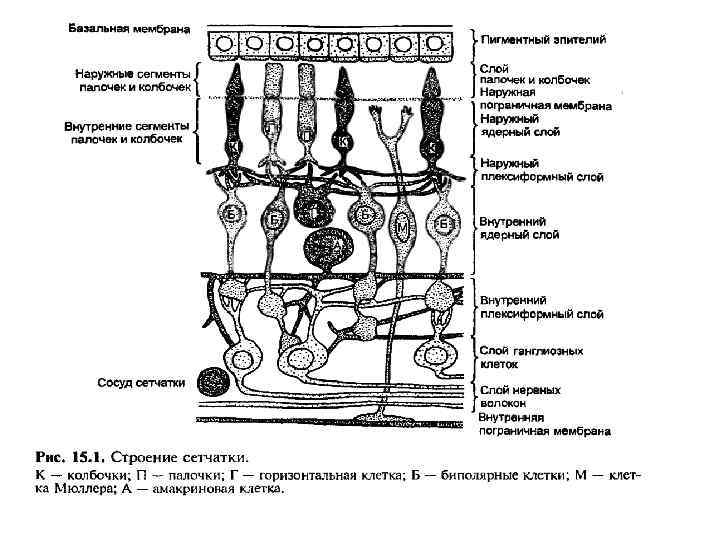 1. пигментный слой; 2. слой палочек и колбочек (фоторецепторы); 3. наружная пограничная мембрана; 4. наружный зернистый слой; 5. наружный сетчатый слой; 6. внутренний зернистый слой; 7. внутренний сетчатый слой; 8. слой ганглиозных клеток; 9. слой нервных волокон; 10. внутренняя пограничная мембрана.