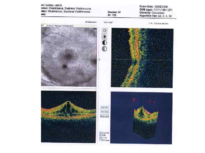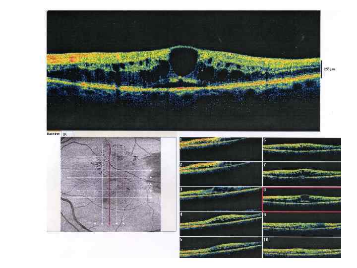 Кистовидный макулярный отёк Это патологическое состояние, представляющее собой накопление жидкости в наружном плексиформном слое центральных отделов макулы, в результате чего формируются видимые кистовидные пространства. Причины: • Хирургические операции (ИЭК – 60%, неосл. ЭЭК – 20%, совр. методы ЭК – 1%, кератопластика) • Лазерные операции (панретинальная коагуляция, иэ) • Медикаменты (никотиновая к-та, пилокарпин, простогла • Дистрофические заболевания (пигментный ретинит) • Воспалительные заболевания (увеит) • Сосудистые нарушения (диабет, окклюзия ЦВС) • Эпиретинальные мембраны
