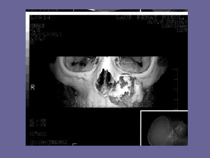 Ошибки, осложнения при оперативном лечении кист челюстей Интраоперационные осложнения 1. 2. 3. 4. Кровотечение Травма нижнего N. alv. inf. Перфорация дна в/чел. Пазухи Перелом инструмента. Постоперационные осложнения 1. Воспаление (остеомиелит) 2. Парестезия 3. Послеоперационная гематома 4. Резорбция краев костной раны 5. Некроз пульпы рядом стоящих зубов 6. Ороназальное/ороантральное Сообщение 7. Расхождение краев раны