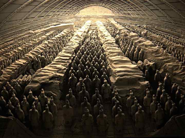 МАВЗОЛЕЙ ИМПЕРАТОРА ЦИНЬ ШИХУАНДИ И «ТЕРРАКОТОВАЯ АРМИЯ» . НАХОДИТСЯ В 35 КМ ОТ ГОРОДА СИАНЯ, ПОСТРОЕН В 221 — 210 ГГ. ДО Н. Э. ДЛЯ ПЕРВОГО ИМПЕРАТОРА ОБЪЕДИНЁННОГО КИТАЯ. НА ЕГО СТРОИТЕЛЬСТВЕ БЫЛИ ЗАНЯТЫ 700 ТЫС. РАБОЧИХ. В ПОДЗЕМНОМ ДВОРЦЕ РАЗМЕЩАЕТСЯ БОЛЕЕ 400 ЗАХОРОНЕНИЙ, ЕГО ПЛОЩАДЬ — БОЛЕЕ 56. 25 КВ. КМ. ГЛАВНОЕ ЭКСПОНАТЫ КОМПЛЕКСА — ТЕРРАКОТОВАЯ АРМИЯ, СЛУЧАЙНО ОБНАРУЖЕННАЯ МЕСТНЫМИ КРЕСТЬЯНАМИ В 1974 ГОДУ. В ТРЁХ СВОДЧАТЫХ ПОДЗЕМНЫХ КАМЕРАХ НАХОДЯТСЯ В ОБЩЕЙ СЛОЖНОСТИ ФИГУРЫ ОКОЛО 7400 СОЛДАТ И ЛОШАДЕЙ И 90 ВОЕННЫХ КОЛЕСНИЦ — ПРАКТИЧЕСКИ ВСЯ ИМПЕРАТОРСКАЯ АРМИЯ. ФИГУРЫ ВЫПОЛНЕНЫ В ПОЛНЫЙ РОСТ, ИХ ВЫСОТА 1, 8 М, КАЖДОЕ ЛИЦО СОЛДАТА УНИКАЛЬНО.