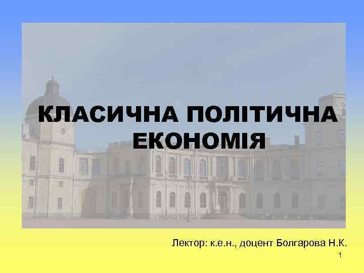 КЛАСИЧНА ПОЛІТИЧНА ЕКОНОМІЯ Лектор: к. е. н. , доцент Болгарова Н. К. 1