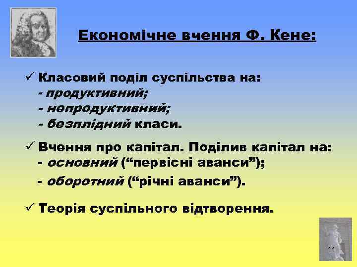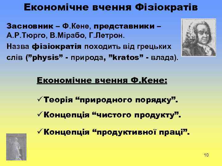 Економічне вчення Фізіократів Засновник – Ф. Кене, представники – А. Р. Тюрго, В. Мірабо, Г. Летрон. Назва фізіократія походить від грецьких слів (”physis” - природа, ”kratos” - влада). Економічне вчення Ф. Кене: üТеорія “природного порядку”. üКонцепція “чистого продукту”. üКонцепція “продуктивної праці”. 10