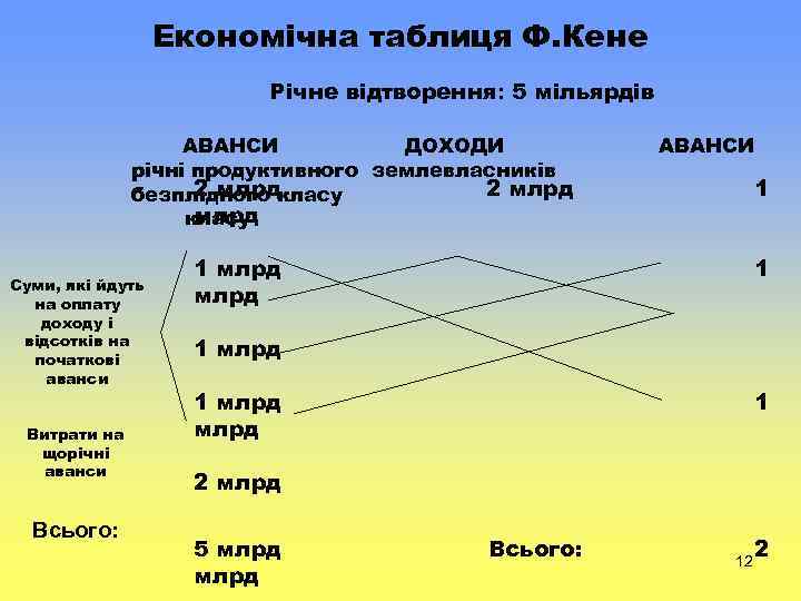 Економічна таблиця Ф. Кене Річне відтворення: 5 мільярдів АВАНСИ ДОХОДИ річні продуктивного землевласників 2 млрд безплідного класу млрд класу Суми, які йдуть на оплату доходу і відсотків на початкові аванси Витрати на щорічні аванси Всього: АВАНСИ 1 1 млрд млрд 1 2 млрд 5 млрд Всього: 12 2