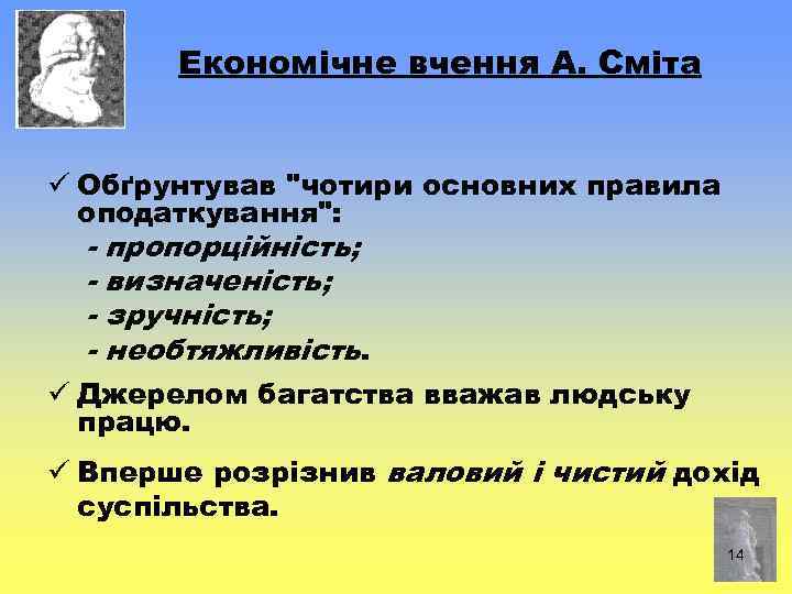 Економічне вчення А. Сміта ü Концепція ”економічної людини”. ü Учення про ”невидиму руку ринку”. ü Виразив ідеї економічного лібералізму. ü Рушійними силами економічного розвитку вважав: - економічну свободу; - конкуренцію. 13