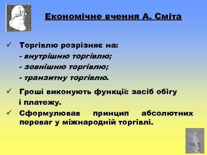 Економічне вчення А. Сміта ü Обґрунтував "чотири основних правила оподаткування": - пропорційність; - визначеність; - зручність; - необтяжливість. ü Джерелом багатства вважав людську працю. ü Вперше розрізнив валовий і чистий дохід суспільства. 14