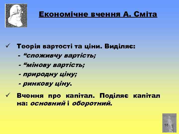 Економічне вчення А. Сміта ü Торгівлю розрізняє на: - внутрішню торгівлю; - зовнішню торгівлю; - транзитну торгівлю. ü Гроші виконують функції: засіб обігу і платежу. ü Сформулював принцип абсолютних переваг у міжнародній торгівлі. 15