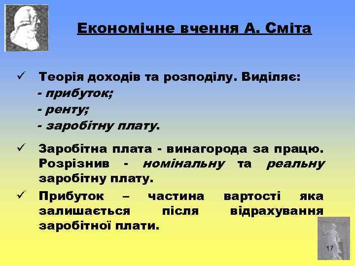 Економічне вчення А. Сміта ü Теорія вартості та ціни. Виділяє: - “споживчу вартість; - “мінову вартість; - природну ціну; - ринкову ціну. ü Вчення про капітал. Поділяє капітал на: основний і оборотний. 16