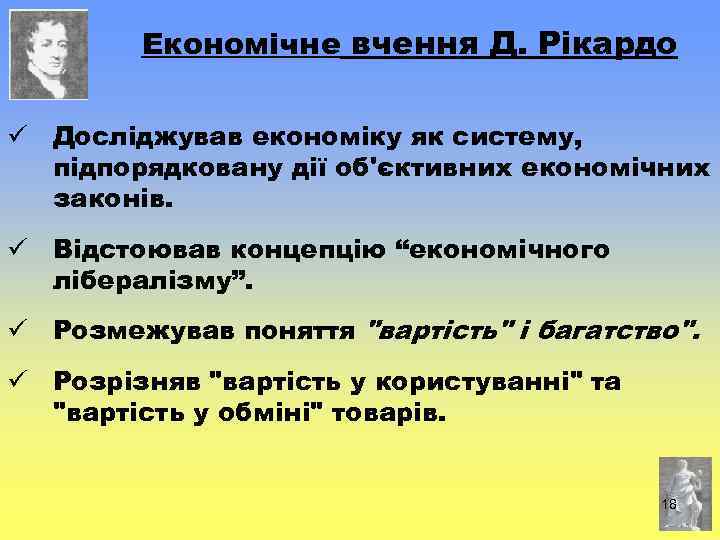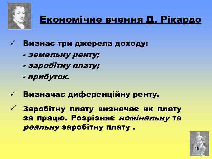Економічне вчення Д. Рікардо ü Досліджував економіку як систему, підпорядковану дії об'єктивних економічних законів. ü Відстоював концепцію “економічного лібералізму”. ü Розмежував поняття "вартість" і багатство". ü Розрізняв "вартість у користуванні" та "вартість у обміні" товарів. 18