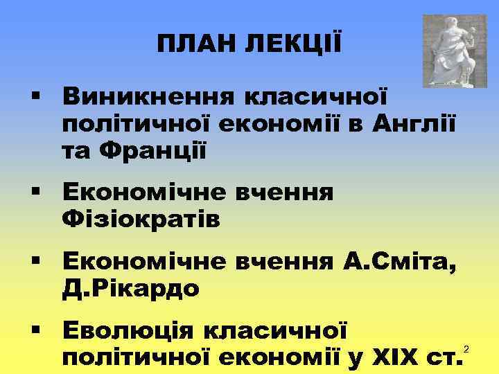 ПЛАН ЛЕКЦІЇ § Виникнення класичної політичної економії в Англії та Франції § Економічне вчення Фізіократів § Економічне вчення А. Сміта, Д. Рікардо § Еволюція класичної політичної економії у XIX ст. 2