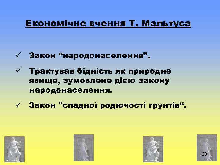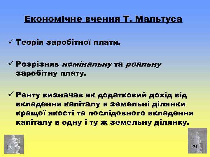 Економічне вчення Т. Мальтуса ü Закон “народонаселення”. ü Трактував бідність як природне явище, зумовлене дією закону народонаселення. ü Закон "спадної родючості ґрунтів“. 20