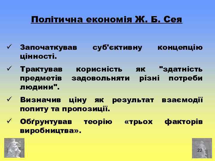 Політична економія Ж. Б. Сея ü Започаткував цінності. ü Трактував предметів людини". суб'єктивну концепцію корисність як "здатність задовольняти різні потреби ü Визначив ціну як результат попиту та пропозиції. ü Обґрунтував теорію виробництва» . «трьох взаємодії факторів 22