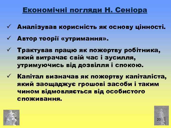 Економічні погляди Н. Сеніора ü Аналізував корисність як основу цінності. ü Автор теорії «утримання» . ü Трактував працю як пожертву робітника, який витрачає свій час і зусилля, утримуючись від дозвілля і спокою. ü Капітал визначав як пожертву капіталіста, який заощаджує грошові засоби і таким чином відмовляється від особистого споживання. 25