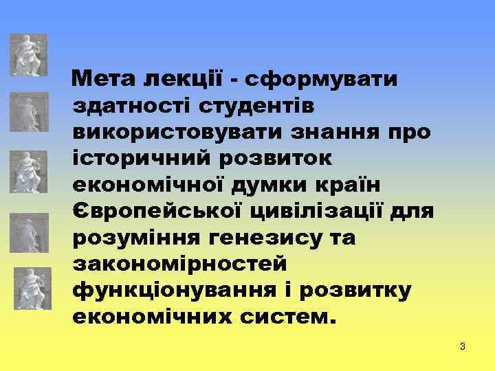 Мета лекції - сформувати здатності студентів використовувати знання про історичний розвиток економічної думки країн Європейської цивілізації для розуміння генезису та закономірностей функціонування і розвитку економічних систем. 3