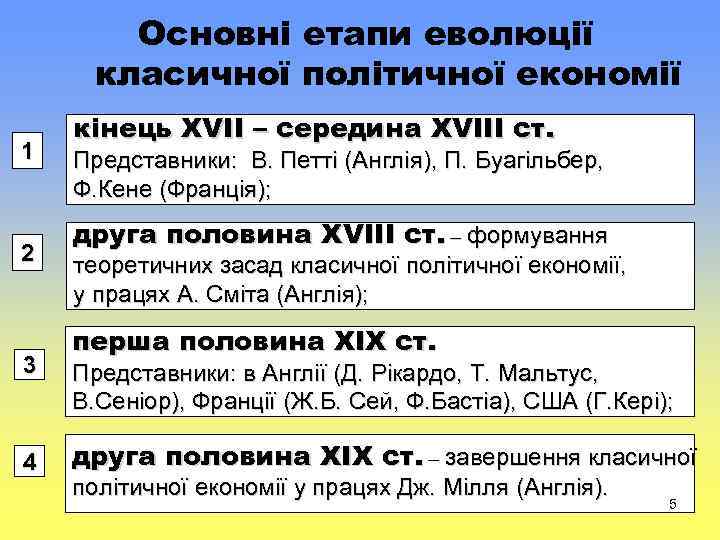 Основні етапи еволюції класичної політичної економії 1 2 3 4 кінець ХVІІ – середина ХVІІІ ст. Представники: В. Петті (Англія), П. Буагільбер, Ф. Кене (Франція); друга половина ХVІІІ ст. – формування теоретичних засад класичної політичної економії, у працях А. Сміта (Англія); перша половина ХІХ ст. Представники: в Англії (Д. Рікардо, Т. Мальтус, В. Сеніор), Франції (Ж. Б. Сей, Ф. Бастіа), США (Г. Кері); друга половина ХІХ ст. – завершення класичної політичної економії у працях Дж. Мілля (Англія). 5