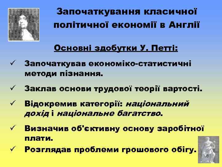 Започаткування класичної політичної економії в Англії Основні здобутки У. Петті: ü Започаткував економіко-статистичні методи пізнання. ü Заклав основи трудової теорії вартості. ü Відокремив категорії: національний дохід і національне багатство. ü Визначив об'єктивну основу заробітної плати. Розглядав проблеми грошового обігу. ü 6