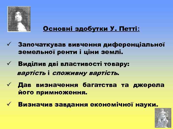 Основні здобутки У. Петті: ü Започаткував вивчення диференціальної земельної ренти і ціни землі. ü Виділив дві властивості товару: вартість і споживну вартість. ü Дав визначення багатства та джерела його примноження. ü Визначив завдання економічної науки. 7