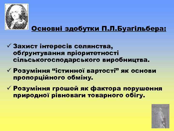 Виникнення класичної політичної економії у Франції Основні здобутки П. Л. Буагільбера: üВизначив завдання економічної науки. üТрактування праці як джерела вартості. üРозуміння багатства як сукупності товарів, створених людською працею. üДжерелом багатства вважав виробництво. 8