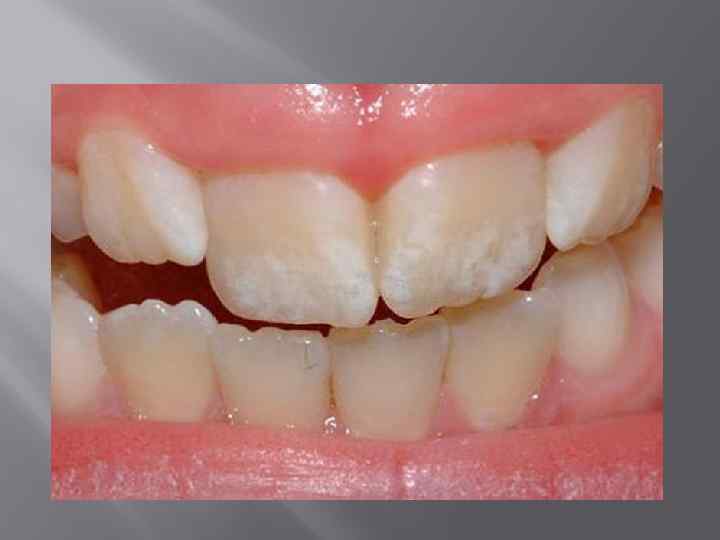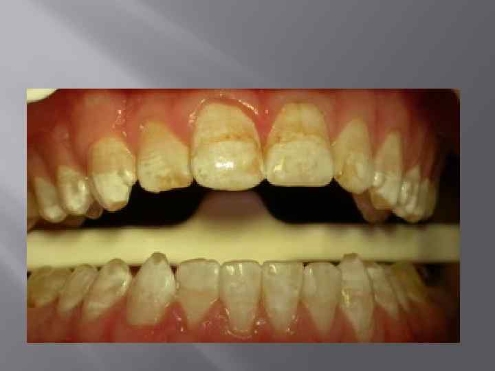 Штриховая форма флюороза характеризуется появлением небольших меловидных полосок — штрихов, расположенных в подповерхностных слоях эмали. Полоски могут быть обозначены хорошо, но часто они выражены слабо и проявляются при высушивании поверхности зуба.