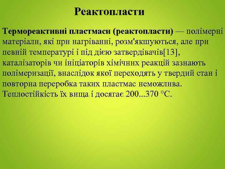 Реактопласти Термореактивні пластмаси (реактопласти) — полімерні матеріали, які при нагріванні, розм'якшуються, але при певній температурі і під дією затвердівачів[13], каталізаторів чи ініціаторів хімічних реакцій зазнають полімеризації, внаслідок якої переходять у твердий стан і повторна переробка таких пластмас неможлива. Теплостійкість їх вища і досягає 200. . . 370 °С.