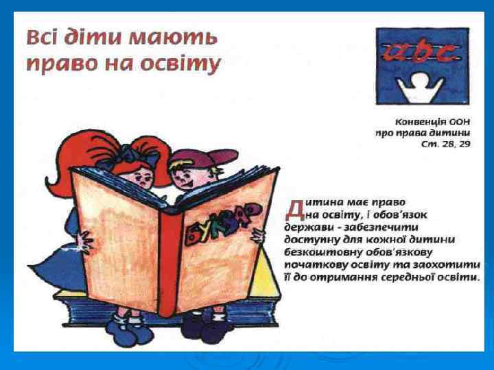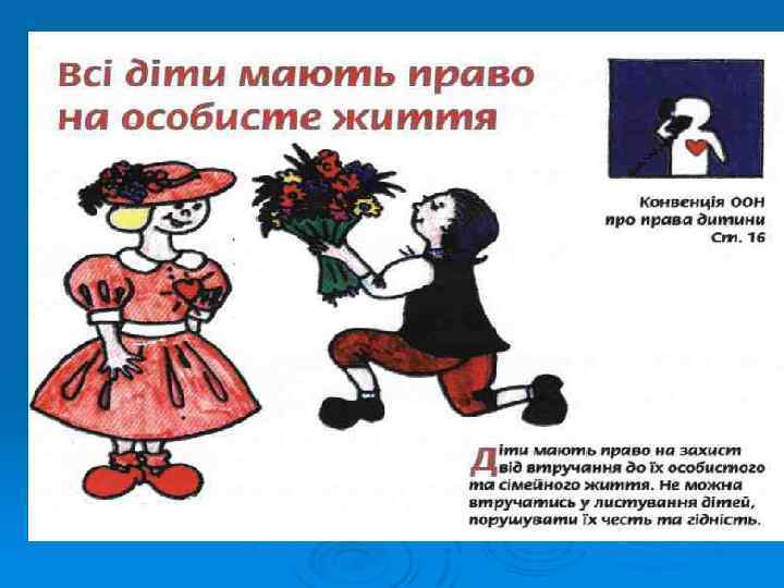 Ø Ø ПРАВА ДІТЕЙ - право на освіту; Ø - на медичну допомогу; Ø - висловлювати свої думки; Ø - право на батьківську турботу; Ø - всі діти рівні у своїх правах; Ø - право на вільне спілкування; Ø - право на відпочинок і дозвілля; Ø Ø ОБОВ`ЯЗКИ ДІТЕЙ - ходити до школи, сумлінно навчатись; Ø - турбуватися про своє здоров’я; Ø - поважати думки інших; Ø - піклування про батьків у старостіповажати близьких та друзів. Ø Ø Не принижувати гідності кожної людини. Поводитись так, щоб своєю поведінкою не порушувати прав іншої людини; Ø - дотримуватись правил моральної етики; - поважати співрозмовників. Коректно і тактовно висловлювати свої думки. Дотримуватись правил мовного етикету. Ø організовувати дозвілля так, щоб воно приносило корись і не заважало іншим;