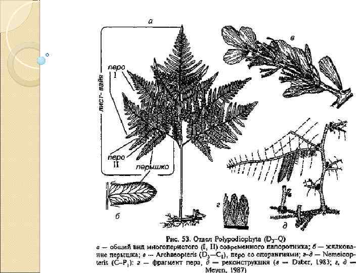 Отряд Marattiales • • • При основании листьев имеются крупные прилистники – особые листовидные придатки Спорангии в большинстве случаев срастаются друг с другом Характерны синангии, иногда спрятанные в спорокарпий (двустворчатое вместилище). Вайи современных и мезозойских родов цельные (редко), просто- или дваждыперистые, пальчатые. В карбоне и перми были вайи четыреждыперистые.