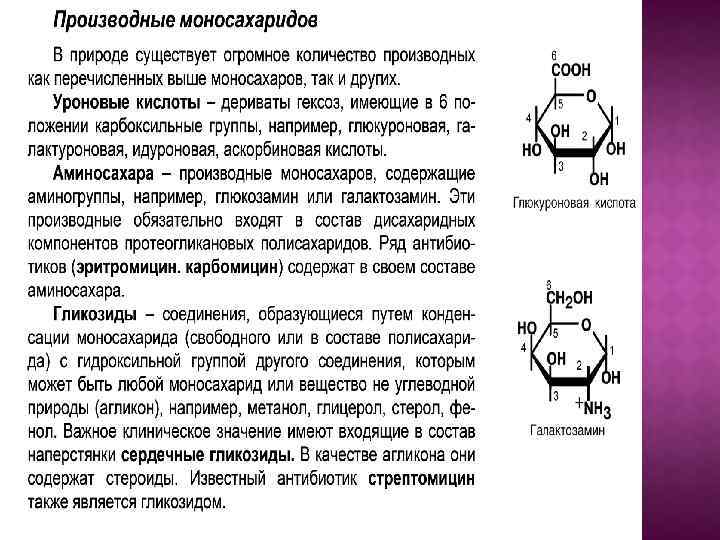 При окислении альдегидных групп альдоз образуется карбоксильная группа, а при их восстановлении — спиртовая группа. Через окисление глюкозы в организме образуется глюкуроновая кислота, а через восстановление — многоатомные спирты (сорбитол, инозитол). При замещении гидроксильной группы на аминогруппу образуются аминосахара, которые входят в состав олигосахаридного компонента гликопротеидов и ганглиозидов. В ряде случаев аминогруппа ацилирована остатком ацетата. Рис. Глюкозамин (1), N-ацетилглюкозамин (2)
