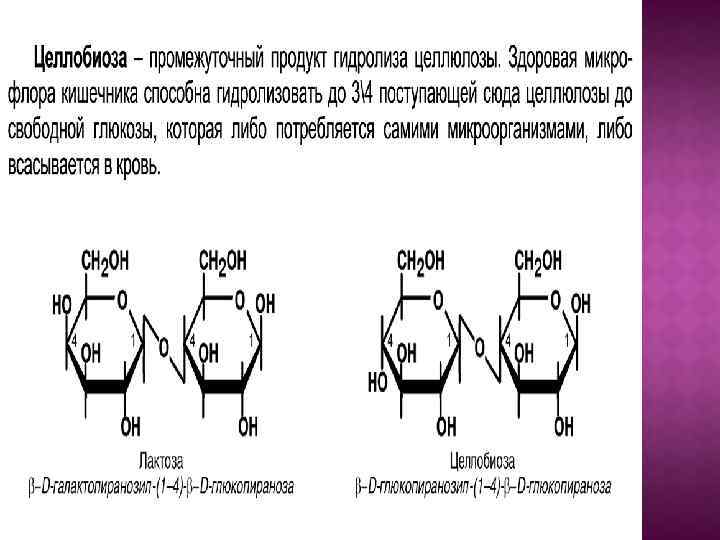 Мальтоза, образуется в ротовой полости или в тонком кишечнике при воздействии, -амилазы слюны или панкреатической -амилазы на крахмал или гликоген. Состоит из двух остатков глюкозы, связанных между собой -1, 4 гликозидной связью. Может быть использована организмом после гидролиза в тонком кишечнике до двух остатков глюкозы с участием фермента мальтазы. Рис. Мальтоза