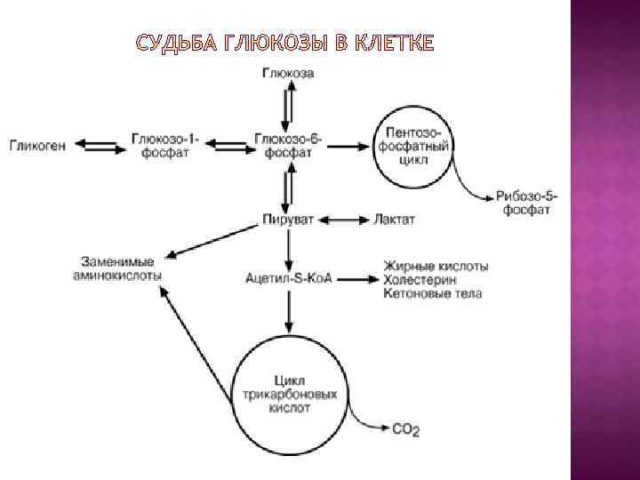 Основные пути расходования глюкозы крови: распад глюкозы в клетках тканей и органов для получения энергии; использование глюкозы на биосинтез гликогена, в основном в печени и скелетных мышцах (запасание энергетического материала); на биосинтез в клетках различных олигосахаридов и гетерополисахаридов; на биосинтез липидов в жировой ткани и др.