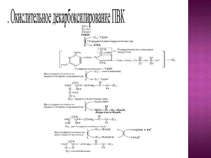 Суммарную реакцию, катализируемую пируватдегидрогеназным комплексом, можно представить следующим образом: Пируват + НАД+ + HS-Ko. A –> Ацетил-Ко. А + НАДН + Н+ + СO. Реакция сопровождается значительным уменьшением стандартной свободной энергии и практически необратима. При недостатке витаминов В 1, В 2, В 5, пантотеата (предшественники ТДФ, ФАД, НАД+ и Ко. А-SH соответственно) снижается скорость окисления пирувата. Накопление пирувата в клетке сдвигает равновесие лактатдегидрогеназной реакции (гликолиз) в сторону образования лактата. Лактат из клеток перемещается в кровь, что может привести к развитию лактацидоза. Окисление ацетил-Ко. А осуществляется в цикле Кребса.