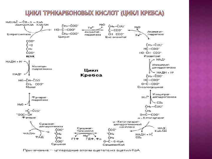 За один оборот цикла, состоящего из восьми фермента- тивных реакций, происходит полное окисление ( «сгорание» ) одной молекулы ацетил-Ко. А. Для непрерывной работы цикла необходимо постоянное поступление в систему ацетил-Ко. А, а коферменты (НАД+ и ФАД), перешедшие в восстановленное состояние, должны снова и снова окисляться. Это окисление осуществляется в системе переносчиков электронов в дыхательной цепи (в цепи дыхательных ферментов), локализованной в мембране митохондрий. Образовавшийся ФАДН 2 прочно связан с сукцинатдегидрогеназа (СДГ), поэтому он передает атомы водорода через Ko. Q. Освобождающаяся в результате окисления ацетил-Ко. А энергия в значительной мере сосредоточивается в макроэргических фосфатных связях АТФ.