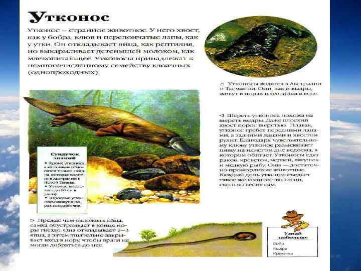 Однопроходные (лат. Monotremata), или яйцекладущие (также иногда клоачные) — единственный современный отряд инфракласса клоачные Однопроходные откладывают два или три очень маленьких круглых яйца, у которых скорлупа гораздо мягче, чем скорлупа птичьих яиц или яиц рептилий. В отличие от других млекопитающих, у однопроходных нет родового канала: яйца появляются на свет по тому же каналу в теле, что моча и фекалии. .