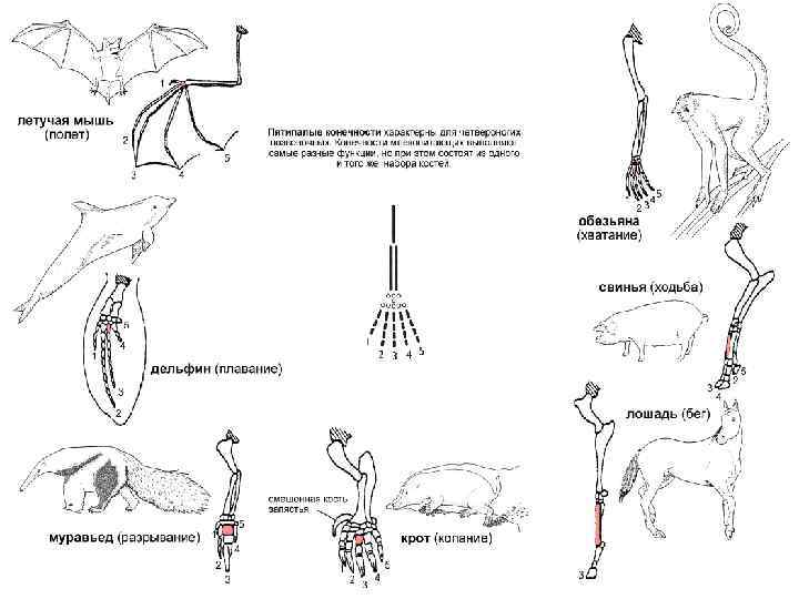 А — стопоходящего Б — пальцеходящего (собака) В—Д — копытных фалангоходящих В — свиньи Г — коровы Д — лошади а — тучевая кость предплечья б — локтевая в — запястье г — добавочная кость запястья д — и — пястные кости к — фаланги пальцев