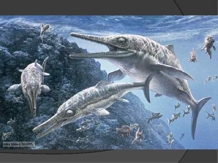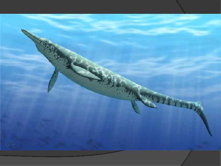 Род Ichthyosaurus J 1 Ихтиоза вры (лат. Ichthyosauria, «рыбоящеры» от греч. — рыба и — ящер) — вымерший отряд крупных (до 24 метров в длину, в среднем 2— 4 метра) морских рептилий, имевших форму, конвергентную рыбам и дельфинам. Предки ихтиозавров, вероятно, спустились в море по руслу одной из доисторических рек, где останки практически не сохраняются, — все известные науке виды уже жили в морской воде и не выбирались на сушу. Были живородящими. Имели эвриапсидное строение черепа, произошли от диапсидных предков. Зубы сменялись неоднократно в течение жизни. Конечности использовались для поддержания равновесия и контроля направления. У хвоста было две лопасти, нижняя из которых поддерживалась позвоночным столбом. У типичного ихтиозавра были очень большие глаза, защищённые костяным кольцом, говорящим о том, что охотились они ночью. В связи с этим, некоторые виды обладали огромными глазами (до 20 см в диаметре). Дополнительно, по-видимому, имелись какие-то кожные рецепторы, типа боковой линии, на что указывают следы нервов и сосудов на костях черепа. Кожа, лишённая чешуи, для лучшего скольжения в воде была, возможно, покрыта слизью. Созданные для скорости, как современный тунец, некоторые ихтиозавры также наводят на предположения, что они были хорошими глубоководными ныряльщиками, как современные киты. Наиболее вероятная окраска — противотень (тёмный верх и светлый низ) с синеватым оттенком. Самый крупный описанный вид по обнаруженным окаменелостям ихтиозавр — шонизавр из позднего триаса полярной Канады (в 2003 году описан скелет длиной около 23 метров). У некоторых ранних ихтиозавров были зубы, с помощью которых они питались моллюсками — аммонитами, наутилоидеми и кальмарами. Очень похоже на то, что они также питались рыбой, а у части более крупных видов были тяжёлые челюсти и зубы, которые показывают, что они питались более мелкими рептилиями. Типовой вид этой группы был описан в 1821 году — Ichthyosaurus communis de la Beche & Conybeare, 1821 typus в составе нового семейства Ichthyosauridae De la Beche & Conybeare, 1821. Ихтиозавры существовали в течение почти всего мезозоя 250— 90 млн лет назад, наибольшего расцвета достигли в юрский период, пока в меловой период их не сменили плезиозавры. В мелу количество видов ихтиозавров резко снизилось, лишь один род — Платиптеригий (Platypterygius) — дожил до начала позднего мела (единственный описанный представитель меловой группы).