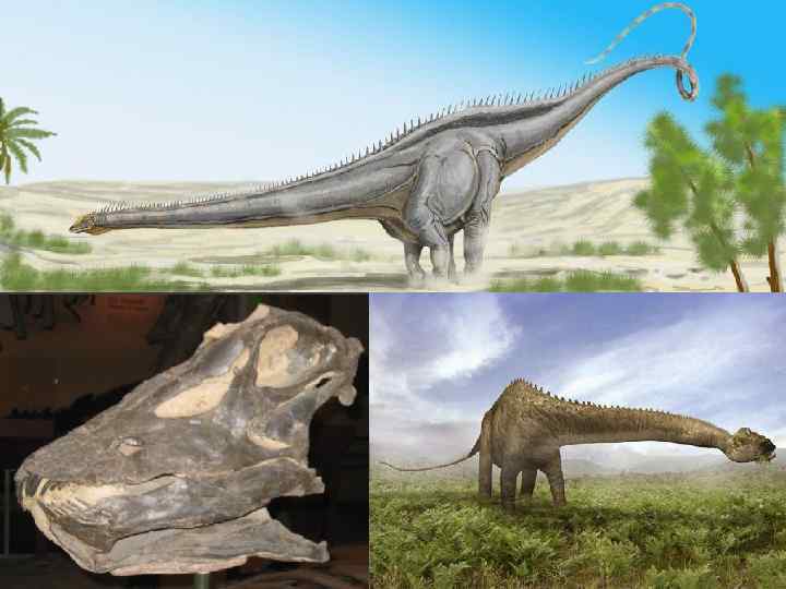 Род Diplodocus J 3 Диплодо к (лат. Diplodocus) — род ящеротазовых динозавров из группы зауропод. Первый окаменелый скелет был найден в 1877 году в Скалистых горах (Колорадо) палеонтологом С. У. Уилистоном (Samuel Wendell Williston). Позже были обнаружены и другие останки в отложениях юрского периода (формация Моррисон). Все они датируются возрастом 150— 147 млн лет назад. Является крупнейшим из динозавров, известных по полным скелетам. Это был один из настоящих гигантов позднеюрского периода. Диплодок достигал в длину 27 метров, но по мнению ученых размеры самых крупных особей могли и вовсе достигать 35 метров. [1] Из них большая часть приходилась на шею и хвост. Кости шеи и хвоста у диплодока были полыми. Вес диплодока по одним оценкам составлял 10— 20 тонн[2], а по другим достигал 20— 80 тонн[3]. Диплодок имел длинную шею, состоящую из 15 позвонков, возможно, заполненных сообщающимися воздушными мешками. Череп диплодока имел непарное носовое отверстие, расположенное не на кончике морды, а в верхней части головы впереди глаз. Зубы в форме узких лопаточек имелись только в передней части рта. Конечности диплодока были пятипалыми, с короткими массивными когтями на внутренних пальцах. Длинный хвост диплодока, заканчивавшийся тонким «хлыстом» , служил прекрасным орудием защиты. Вероятно, диплодоки вели стадный образ жизни, питаясь листьями невысоких деревьев. Не умея жевать, они заглатывали камни, которые помогали им перетирать пищу. Подобно брахиозавру, диплодок передвигался на четырех ногах, причём задние были длиннее передних.
